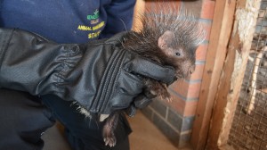 The porcupette is handled for the first time by a Reaseheath zoo keeper