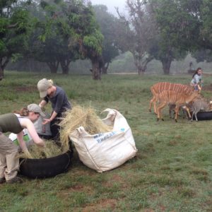 You are here: Home1 / 2 / Animal science undergraduates praised for South African projects3 / Charlie Lyne Becky Bennet feed nyala and common duiker sqaure