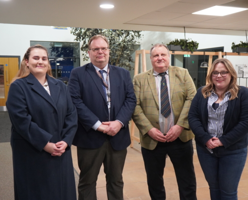 Reaseheath’s T Level in Agriculture students enjoy tea and cake in the classroom, accompanied by Susan Huxley and Course Manager Gemma Mills