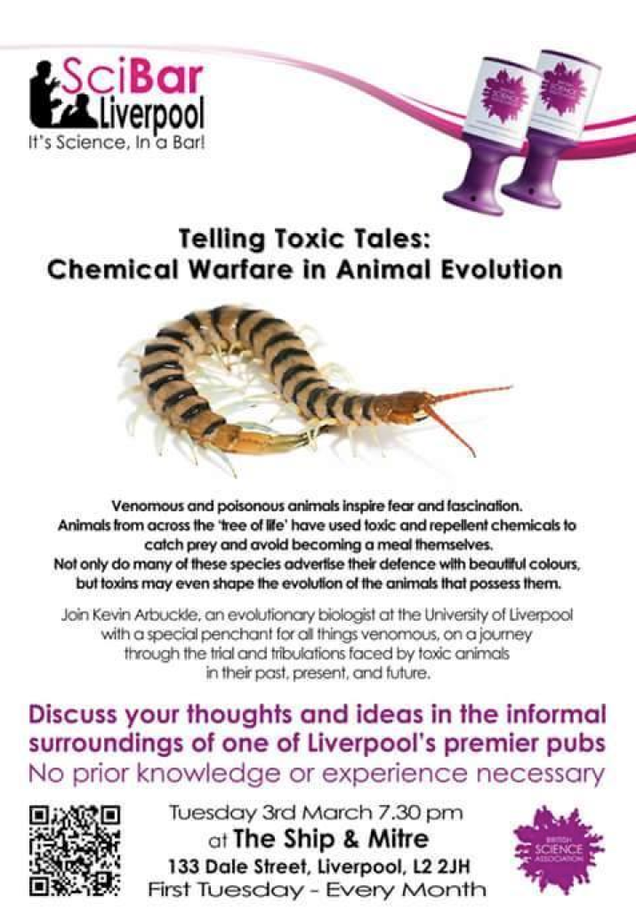 A couple of the Reaseheath Herpetological and Entomological Society (RHES) members attended the monthly SciBar gathering in Liverpool. Held at The Ship and Mitre pub on Tuesday the 3rd of March, this meeting hosted Kevin Arbuckle, evolutionary biologist from the University of Liverpool. Kevin gave a talk on Telling Toxic Tales: Chemical Warfare in Animal Evolution. The talk described many of different varieties of venoms and poisons that are out there in the wild. Also described were the different methods of not only obtaining these toxins, but the various methods of delivery used by a wide range of reptiles, amphibians and invertebrates as well as the select few mammal and bird species which use venoms or poison to their advantage.