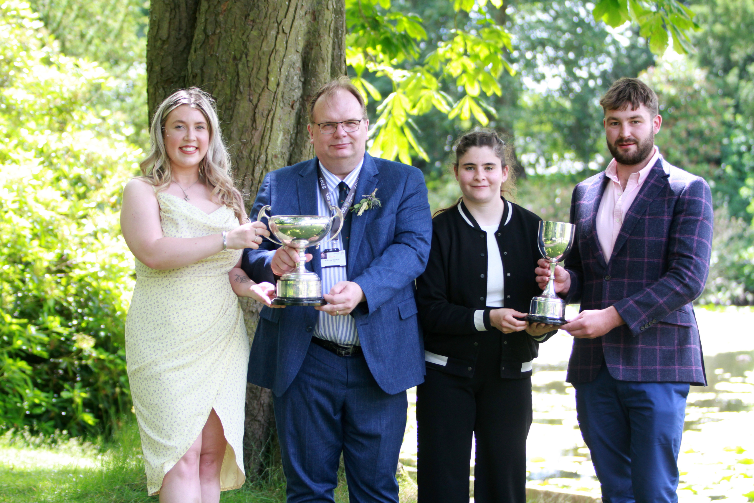 16. Sophie Connor, winner of the Cross College Award National Westminster Bank Cup for Best All Round Contribution to the College, with Principal Marcus Clinton, Elle Baldwin winner of the JK Lamberton Trophy awarded for Personal Qualities, and Forestry and Arboriculture alumnus Twm Brunton.