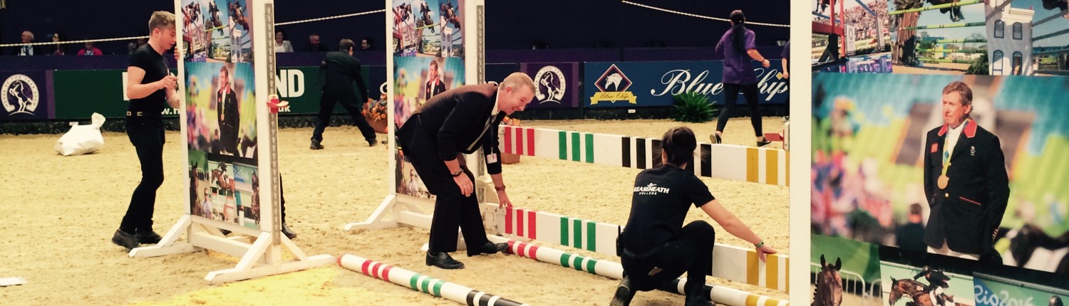 The students, led by Curriculum Area Manager Kerry Owen and Equine Lecturer Jennifer Nash, supported international course designers Bob Ellis and Kelvin Bywater and their team of 12 professional course builders as they built courses to test the world’s leading showjumpers. They also prepared the international arena for highlights such as the showing, working hunter and dressage championships, the Pony Club mounted games and the harness scurry. Other duties included assisting Gilles Fortier and his highly trained performers, who gave a spectacular display involving precision riding, fire, music and gymnastics.