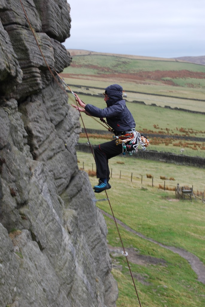 “As you can see from the picture we put an orange rope above each climber, this was secured to the top of the crag and operated by an experienced climber. This allows the climber to ‘lead’ the climb placing pieces of gear. At each one they weigh it, then jump down a little way, then finally they take a full lead fall onto the gear.”