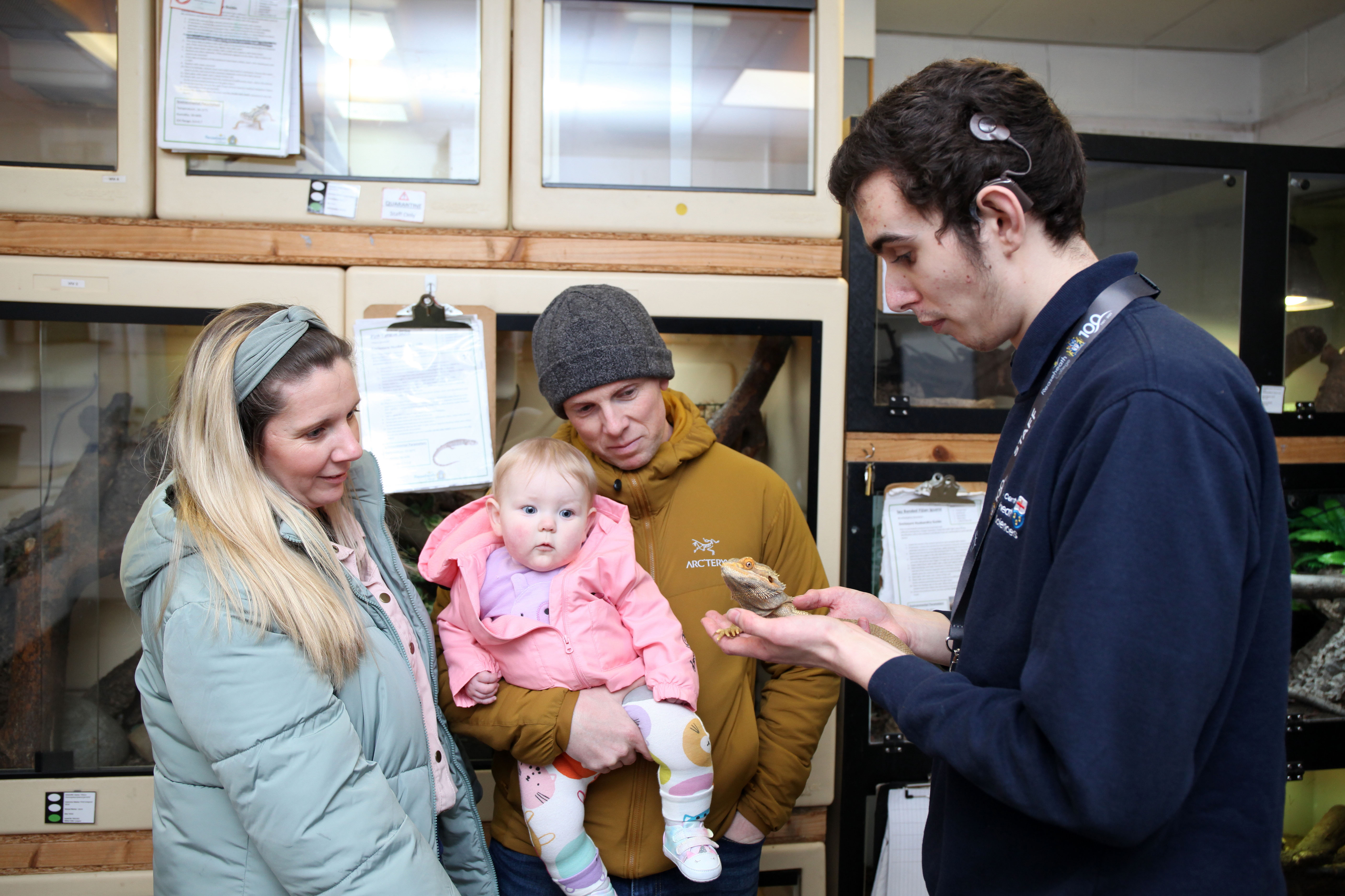 You are here: Home1 / 2 / Families flock to Reaseheath College’s lambing weekend3 / Louise, Charlotte (9 months) and Matthew with Keeper Robert Braithwaite...
