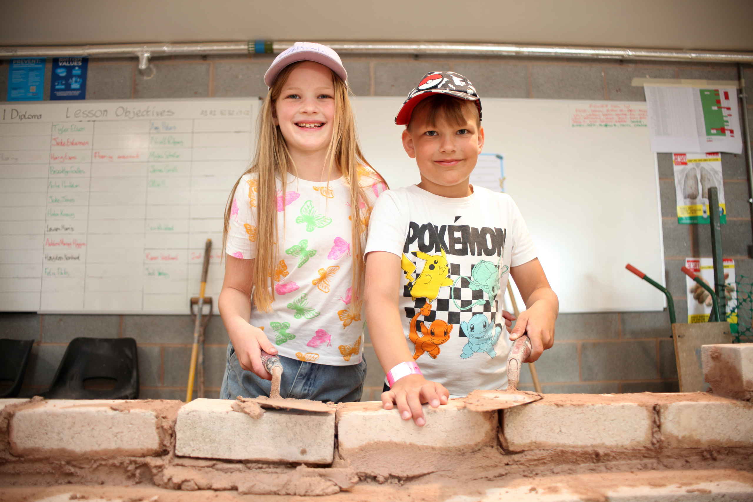 RHFF25_Ava, aged 9 and Arthur, aged 7, take on the bricklaying challenge at the Construction Department_01