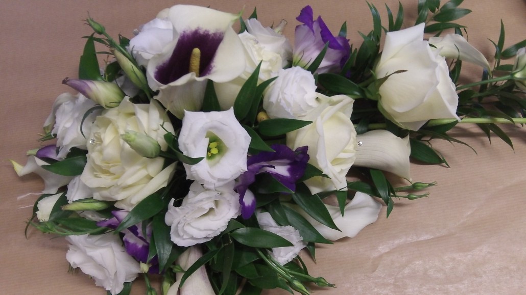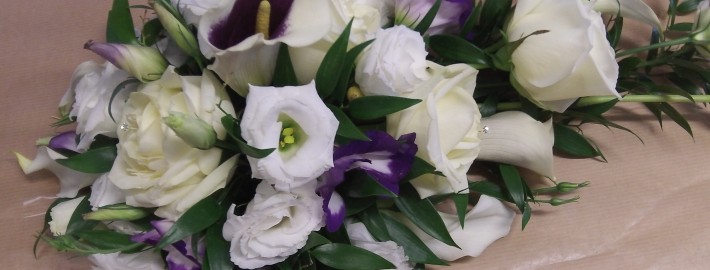 The bride had ordered six table top designs, a top table arrangement, two spray bouquets, two bridesmaid posies and buttonholes. Each student was allocated a task and the flowers were prepared in class on Wednesday afternoon. The students used an assortment of large and medium Rosa, purple Eustoma, Cymbidium orchid, Anthuriums and Cala lilies with Monstera and tropical foliage. The designs constructed on Wednesday were then stored in the cool room ready for the wedding on Friday afternoon.