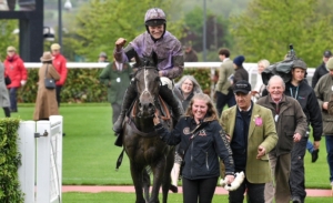 Final header Trainer Hannah Roach leads in Iskandar Pecos with Huw Edwards abord