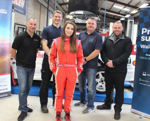 Reaseheath ralleymakers Gareth Baister, Wayne Dyson, Simon Bishop, Lisa Boardman and Sam Straker join rally driver Jade Paveley