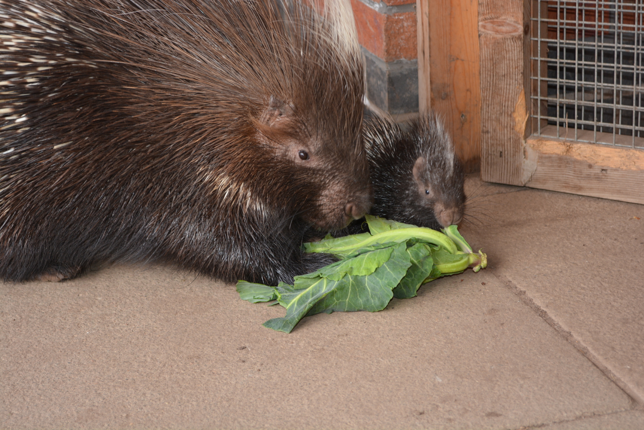 You are here: Home1 / 2 / New family arrivals for Henning the porcupine3 / porcupette with mum eating cabbage