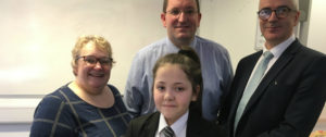 You are here: Home1 / 2 / Pupils rise to Reaseheath’s bake-off challenge3 / Krystal shows off her cake with Sam Copeland Nick Blakemore and Sir William...