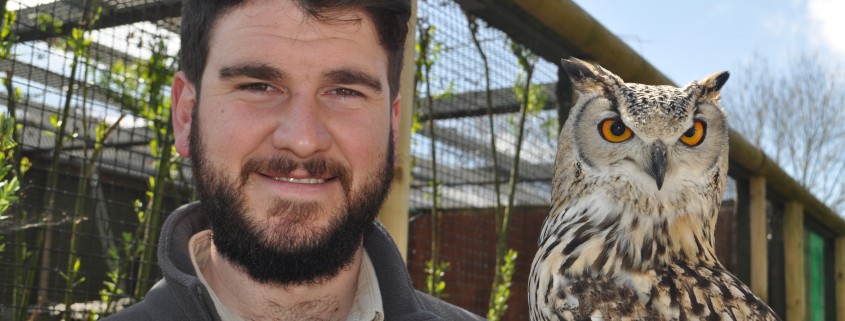 Header caption: Caption: Joe Cooper pictured with Ravi, Reaseheath’s Indian Eagle owl