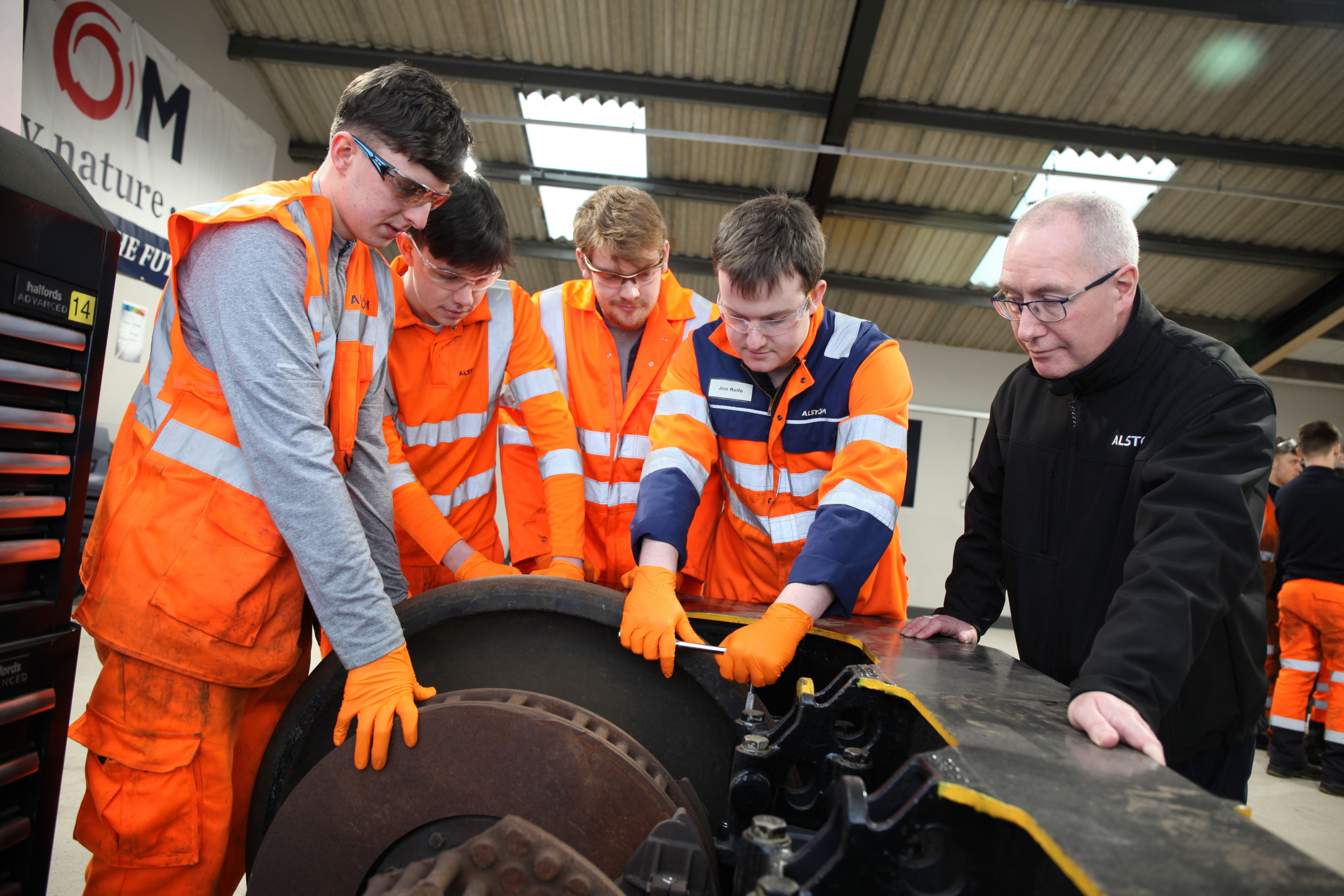 You are here: Home1 / 2 / Reaseheath College and Alstom celebrate successful apprenticeship programme during National Apprenticeship Week3 / Cameron Sant, Harry Theaker, Callum Billington, Joe Rolfe inspecting bogey...