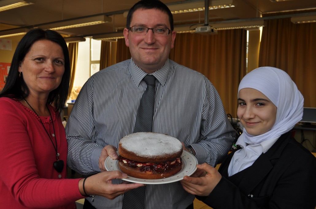 Dia Alwaa shows off her Victoria sponge cake to Nick Blakemore and Reaseheath’s Food Training and Communications Co-ordinator Julie Bent