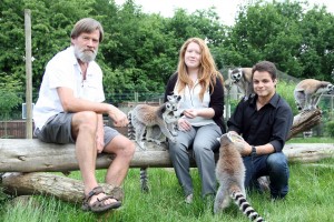 Conservationist Ian Redmond with undergraduates Harley Merrigan and James Wylor-Owen with ring tailed lemurs