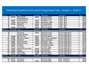 Reaseheath British Showjumping Times – Cat 1 – 06.08.22