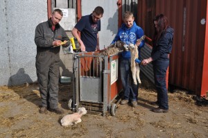 You are here: Home1 / 2 / Reaseheath students look for alternative to soya in sheep feed3 / weighing ewe Callum Pitchford, Chris Adamson, Morgan Spencer and Laura...
