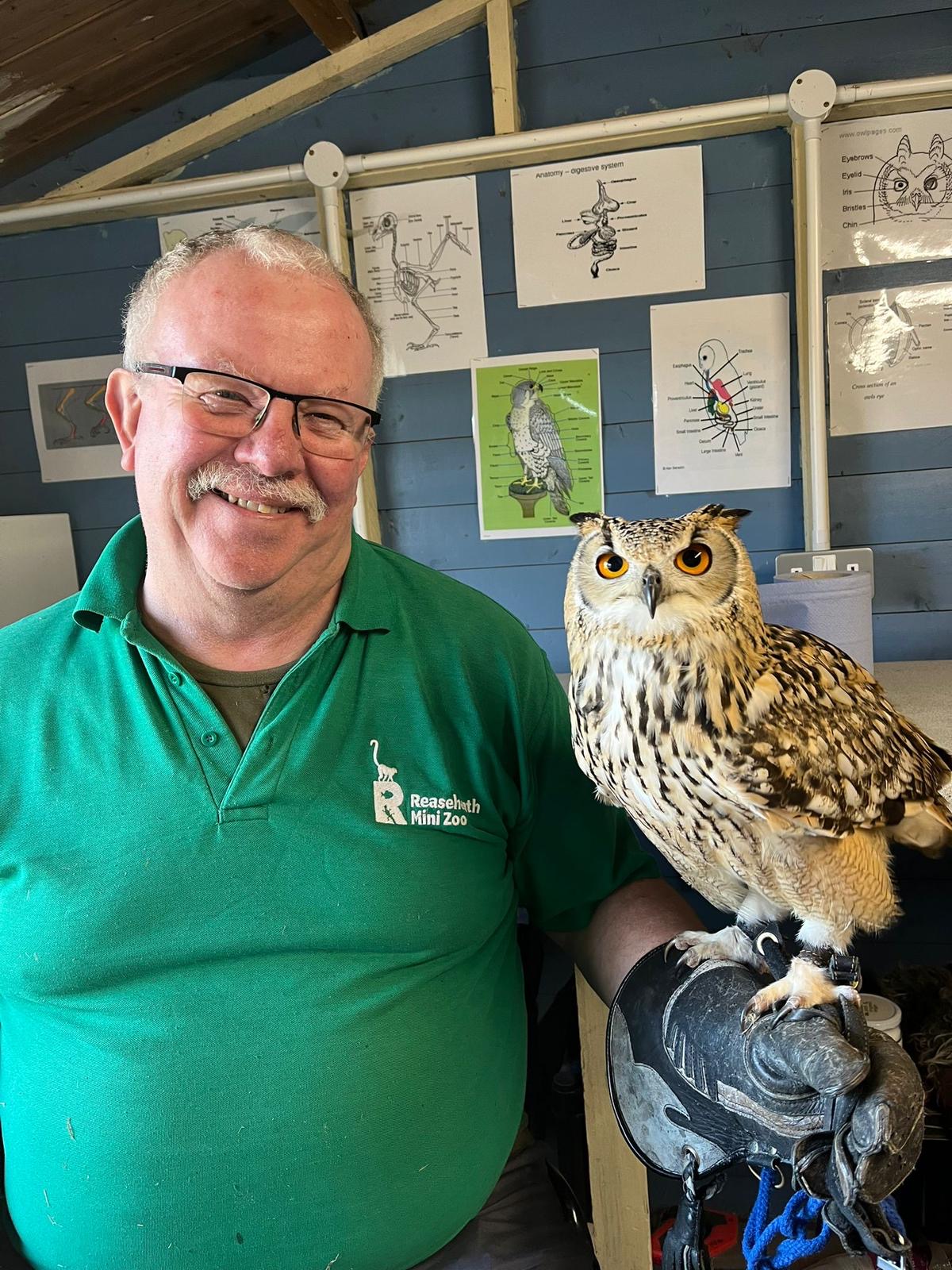 You are here: Home1 / 2 / Reaseheath Zookeeper shares incredible career journey3 / Alan with owl in Reaseheath’s Mini Zoo
