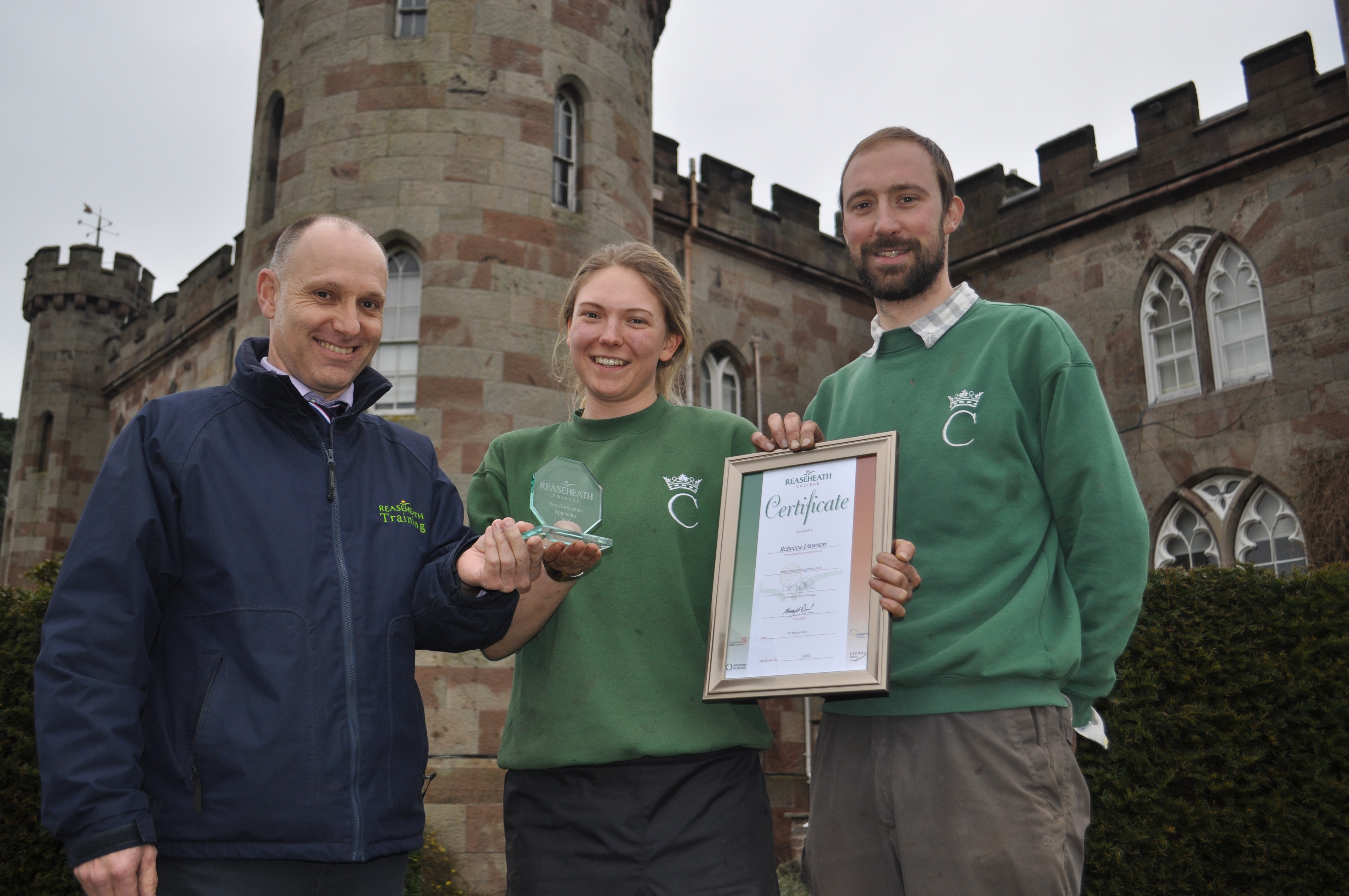 You are here: Home1 / 2 / Second award for apprentice gardener Rebecca3 / Lyndon Smith, Rebecca Dawson and Barry Grain at Cholmondeley