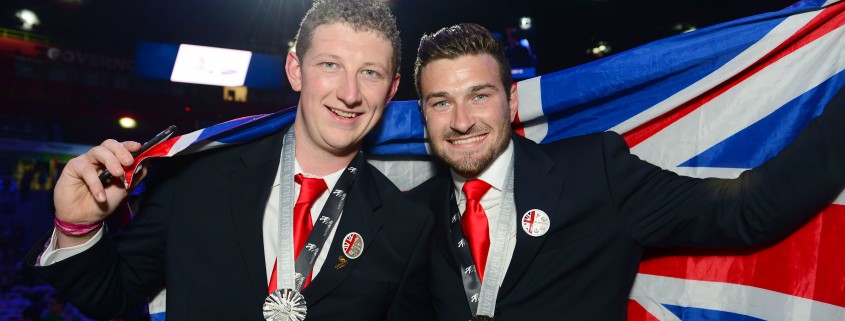 Header caption: Matt Beesley (right) and Jonathan Gill celebrate at the WorldSkills finals in Sao Paulo