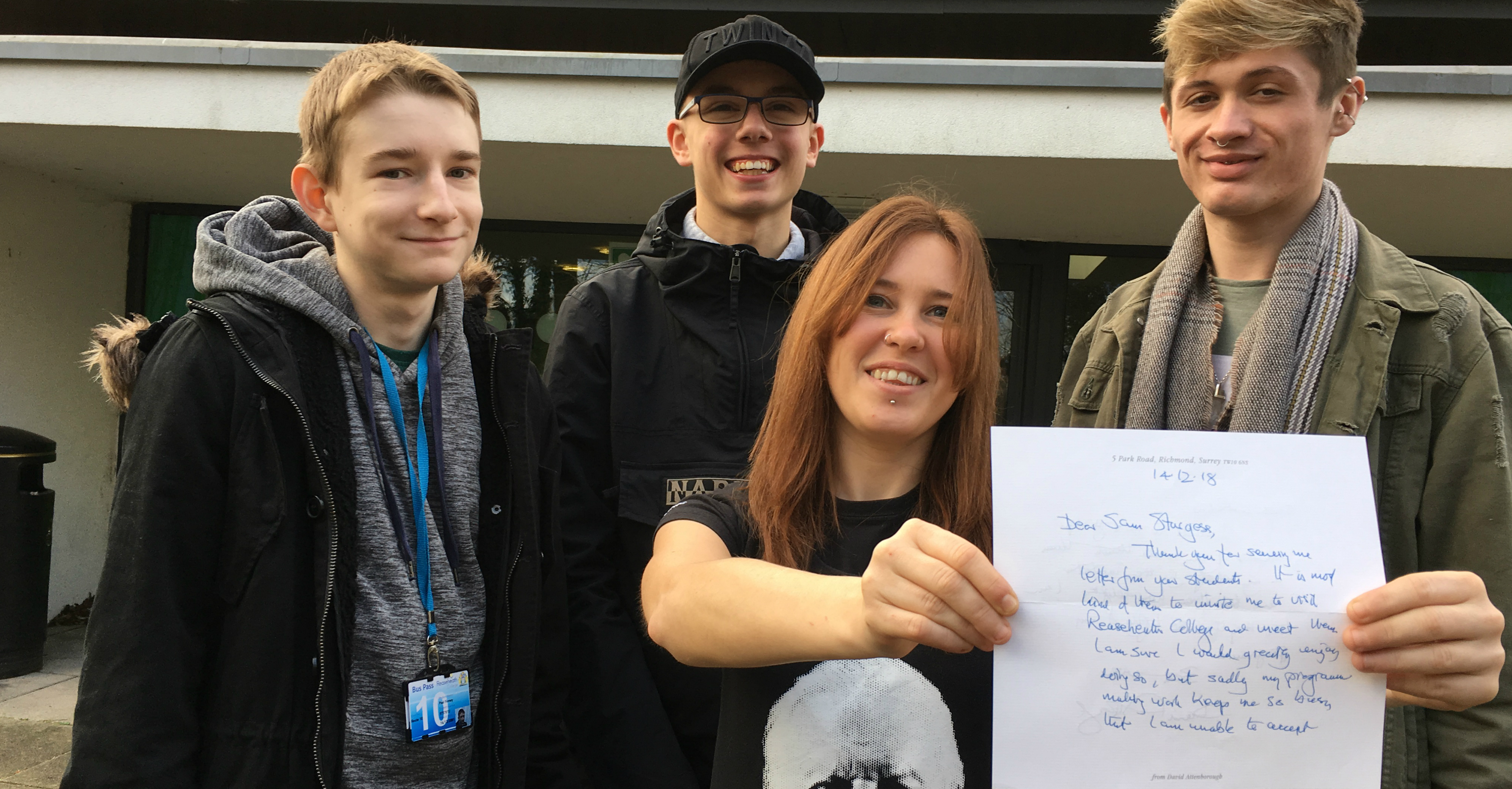 You are here: Home1 / 2 / Sir David Attenborough sends handwritten message to students3 / Clair and fellow students Joel Catterall, Paul Finney and Francis Hitchins...