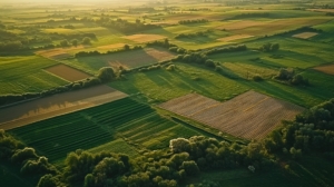 You are here: Home1 / 2 / Aerial perspective of farmland highlighting lush green fields and brown...