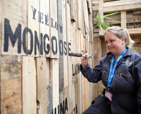 Course Manager Sean McIntyre, who led the project, explained: “The students had been studying the illegal wildlife trade and wanted to highlight this in their design, which is based on a deserted poaching outpost. They also wanted to give the mongooses a more desert-like habitat and added pipes, tunnels and crates for their enrichment.