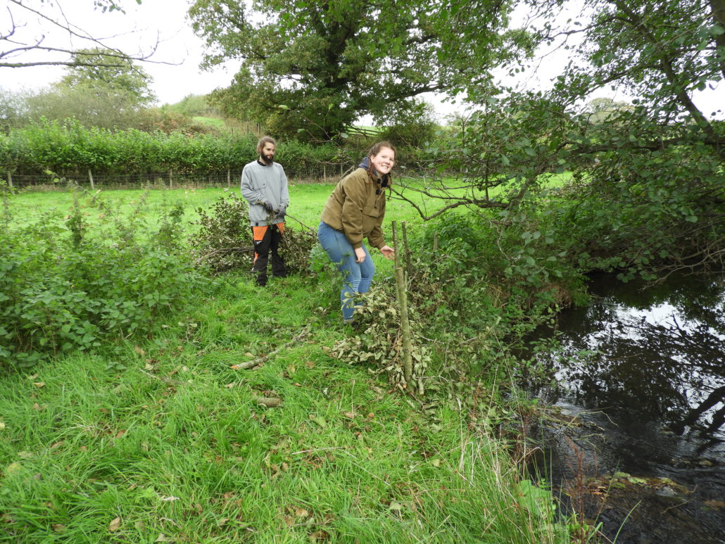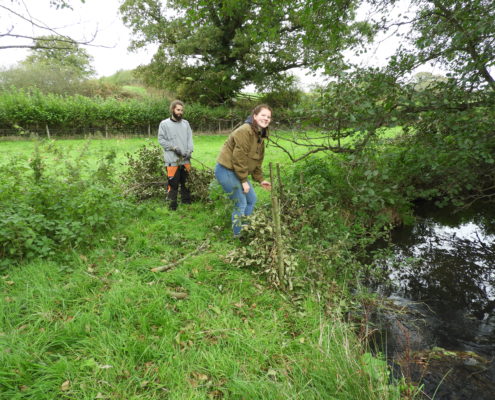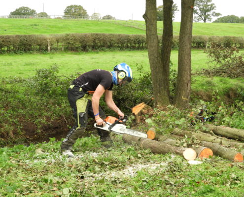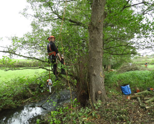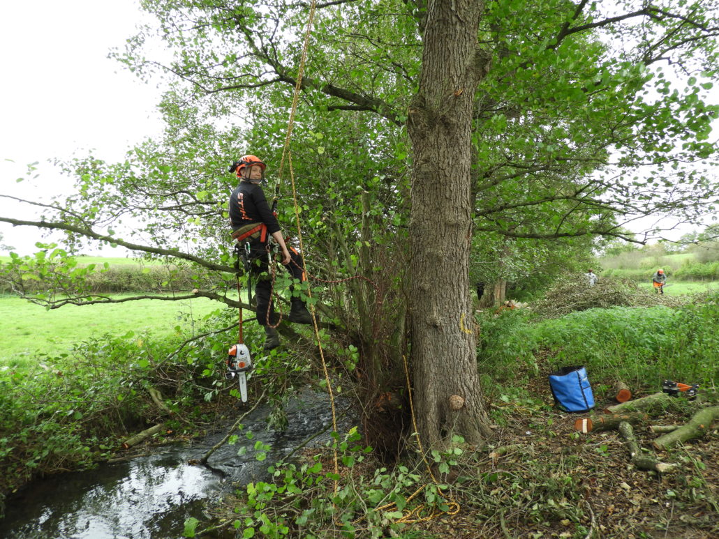 Reaseheath Level 2 arboriculture students have been undertaking practical habitat enhancement works at Charity Farm, near Bangor-on-Dee. Students have been practicing their aerial tree climbing skills by coppicing mature Alder trees along the Emral brook. The cutting of selected trees down to ground level increases light levels on to the watercourse improving its value for wildlife by providing a more varied habitat. Farmer Malcolm Adams is delighted with the work undertaken and described the students as a ‘pleasure to have on his farm.’ Bankside stabilisation work has also been undertaken with the brash by staking and weaving smaller branches along the brook in areas where erosion was a concern.