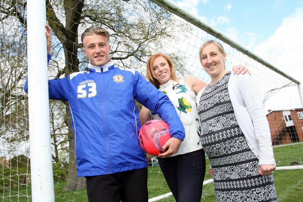 Caption: Crewe Alex forward George Cooper celebrates winning LFE ‘Apprentice of the Year’ with Reaseheath sports lecturers Louise Finney and Lauren Goff