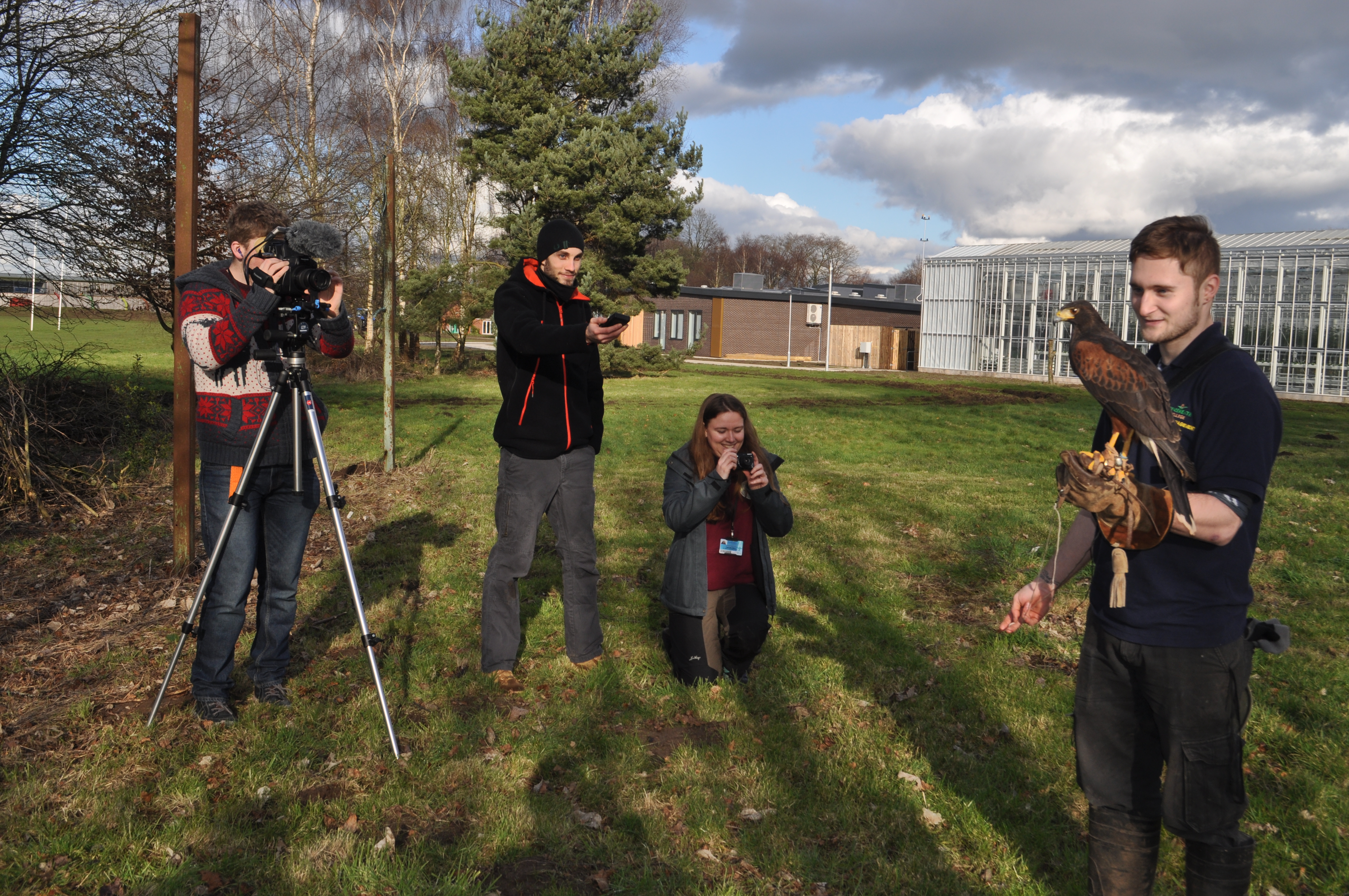 You are here: Home1 / 2 / Wildlife undergraduates introduced to life behind the lens3 / Gareth Myers-Cann, Georgio Casiraghi and Rachel Ball film Harris hawk ...